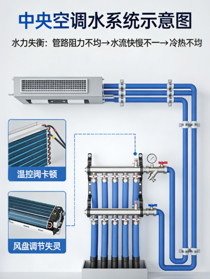 这是中央空调系统的常见隐患。写字楼空调水系统中,管路阻力不均会导致水力失衡,部分区域水流过快、供冷/供热过量,部分区域水流缓慢、能量供给不足,直接造成高低楼层、不同区域的温度差。尤其是老旧写字楼,管路老化、阀门损耗会加剧这一问题。